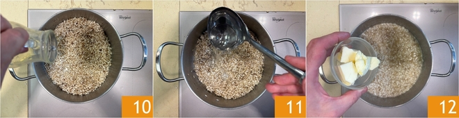 Deglaze with a bit of Prosecco 10 and once the alcohol scent has evaporated, start wetting the rice with hot salted water 11. Continue to add a little at a time until the rice is cooked. Finally, with the heat off, stir in the cold fridge butter 12.