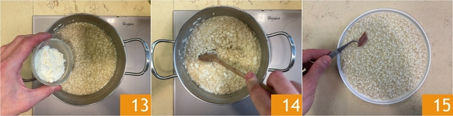 Add the parmesan as well 13 and mix well 14. Plate the rice and distribute pieces of anchovies on the surface 15.