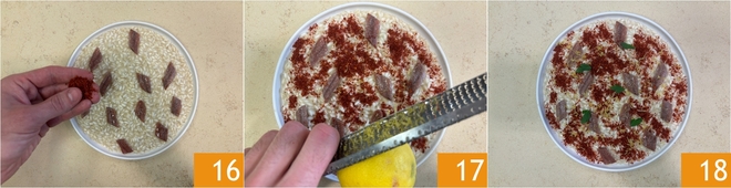 Complete with the crunchy pepper powder 16, lemon zest 17, and chervil sprouts 18. Your risotto with butter, anchovies, and crunchy peppers is ready to be enjoyed!