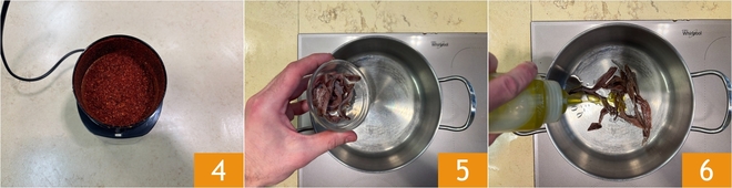 Operate the blades and blend to obtain a powder 4. Set aside and take care of the risotto: in a saucepan, pour the anchovies 5 and a bit of oil 6.