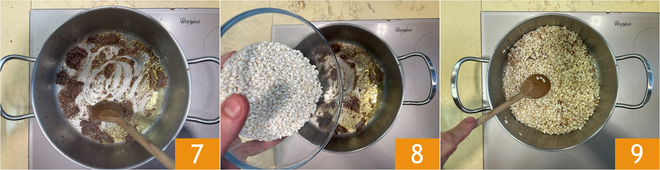 Let them melt at a gentle temperature, stirring with a wooden spoon 7, then add the rice 8, mix well and toast it 9.