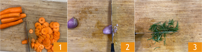 To prepare the carrot risotto with breadcrumbs, start by peeling the carrots and cutting them into thin slices 1. Clean and finely chop the shallot 2 and rosemary 3.