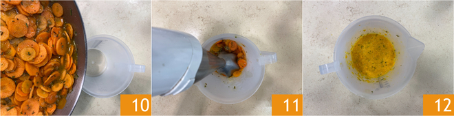 Transfer the carrots to a tall glass 10 and blend with an immersion blender 11 until a creamy consistency is achieved 12. If necessary, add a little more broth.
