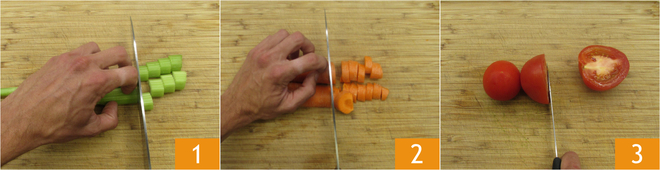 To prepare the Champagne and Langoustine Risotto, start with the vegetables for the broth, coarsely chop the celery 1, carrot with the skin, tomatoes 3, and leeks.