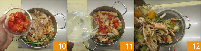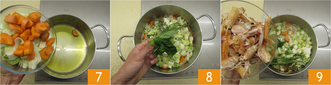 At this point, heat a drizzle of oil in a saucepan with high sides and toast the vegetables 7 for a few minutes over high heat, add the aromatic herbs 8 the shells 9,