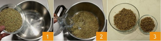 To prepare the risotto with cotechino, lentils, and sparkling wine, start with the Vegetable broth, then move to the lentils: place them in a large pot 1 and add water 2 until they are covered. Turn on medium heat and cook for at least 40 minutes. Then divide the lentils into 2 bowls: pour 1/3 of the legumes into one and 2/3 into the other 3.
