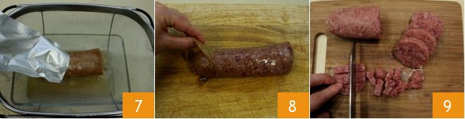Boil the pre-cooked cotechino in a pot with boiling water following the instructions on the package (it will take about 15 minutes). After the required time, drain it and place it in a small bowl to remove the outer casing 7, being careful not to burn yourself with the liquid in the package. Remove the cotechino skin 8, then slice it and cut into small pieces 9.