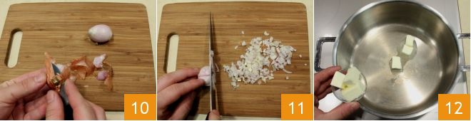Then clean 10 and finely chop the shallot 11. In a large pot, add 2 tablespoons of butter cut into pieces 12 and melt it almost completely over very low heat, stirring with a wooden spoon to prevent the butter from burning.