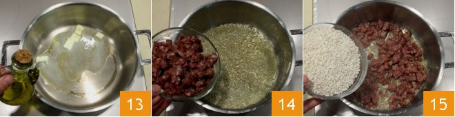 Add a drizzle of oil 13, then add the shallot and let it soften. At this point, add the diced cotechino 14 and the rice 15.