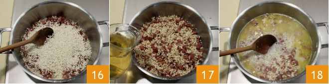 Stir with a wooden spoon 16 and toast the rice for a few minutes, then pour in the sparkling wine 17 and let it evaporate for a few moments, stirring. Add one or two tablespoons of broth to aid cooking 18. Cook on low heat for about 15 minutes.