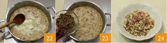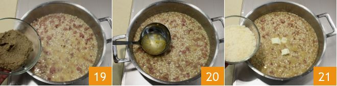Then add the lentil cream 19, stir, and add one or more tablespoons of broth if necessary 20, and cook for another 10-15 minutes. Then, a few minutes before the end of cooking, add the remaining butter and the grated Parmesan cheese 21.