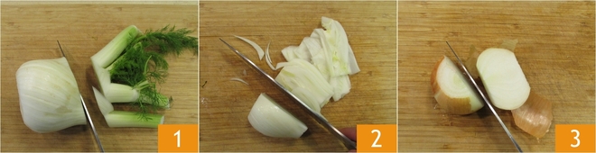 Finely chop one of the halves of the onion 4. Pour the fennel cleaning scraps and the other half of the onion into a pot full of water 5. Bring to a boil. Meanwhile, pour some olive oil and the chopped onion into a pan 6.