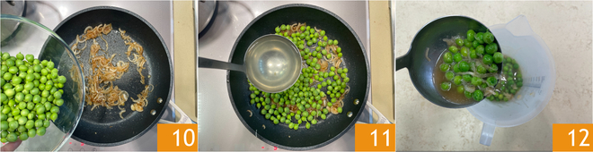 Once the green onion is wilted, add the peas 10, saving a handful for garnishing the dishes, add a ladle of broth 11 and cook gently, it will take 10-15 minutes. Once ready, pour the peas into a jug 12.