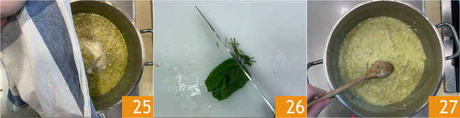 Turn off the heat, stir in grated Parmigiano Reggiano DOP, robiola 22, butter, pepper, and lemon zest 34.
