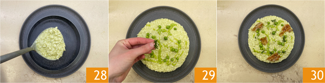 Serve the risotto using a ring to maintain its shape 28, then garnish with fresh peas, mint 29, and guanciale 30. The risotto with pea cream and guanciale is ready to be enjoyed.
