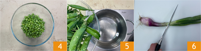 Set aside the peas 4 and use the pods to prepare a vegetable broth 5. Clean the green onion 6.