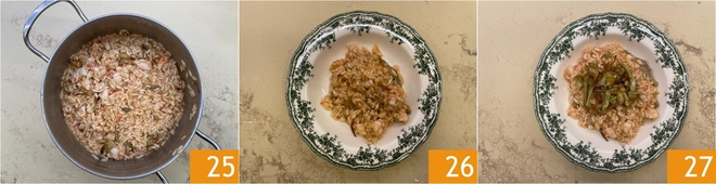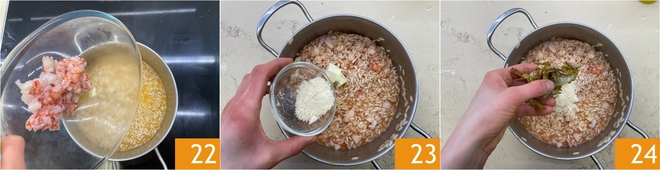 When the rice is almost cooked, add the shrimp pieces 22 and stir, adjusting the consistency with more hot liquid if necessary. Once cooked, turn off the heat and cream with butter and grated Parmesan cheese 23. Also add about three-quarters of the fried artichokes 34.