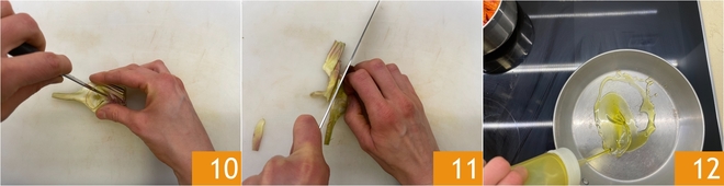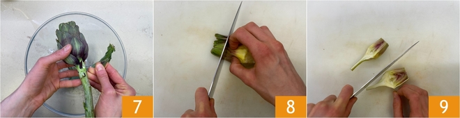 Move on to the How to clean artichokes: remove the tougher outer leaves 7, peel the stem and cut the tips 8, then halve them 9.