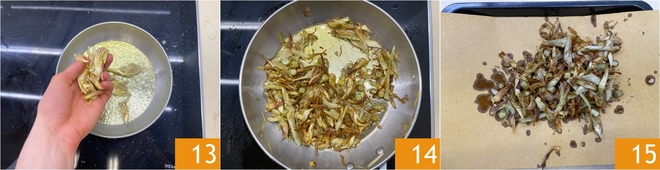 Add the artichokes 13 and sauté over medium-high heat until they are golden and crispy 14. Transfer them to paper towels to remove excess oil and set aside 15.