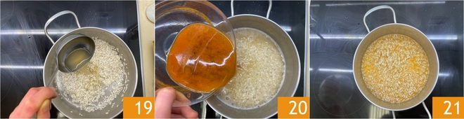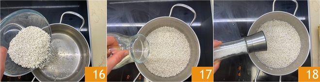 Now focus on the risotto: in a hot saucepan, pour the rice and toast it dry 16, stirring until the grains become shiny. Deglaze with the remaining 1.8 oz of white wine and let it evaporate 17, then salt 18.