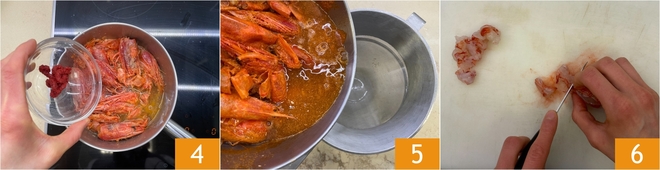 Add the tomato paste 4 and 2 oz of water, then cook for about 5 minutes. At the end of cooking, strain the resulting broth through a fine sieve, pressing well on the shells, and keep the bisque warm 5. Now cut the shrimp meat into regular pieces and set aside 6.