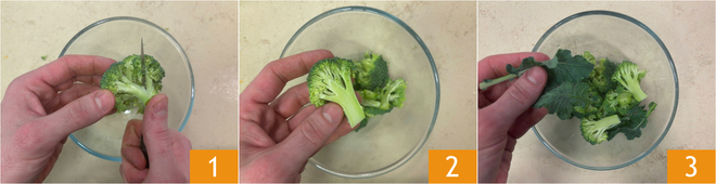 To prepare the risotto with stracchino, broccoli, and anchovies, first clean the broccoli, take 4 larger florets, totaling about 100 grams (3.5 oz) 1 and divide in half 2. Add the green leaves to the florets 3.
