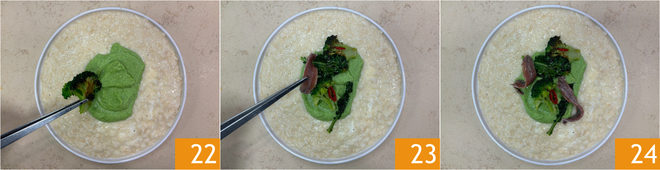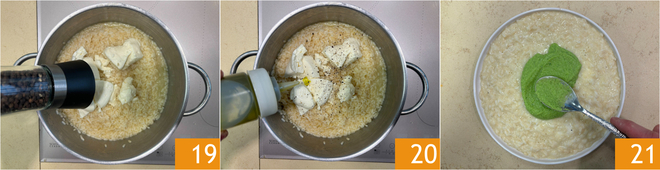 Adjust the salt and pepper 19, pour a drizzle of oil 20, and mix. Plate the rice and place a spoonful of broccoli cream in the center 21.