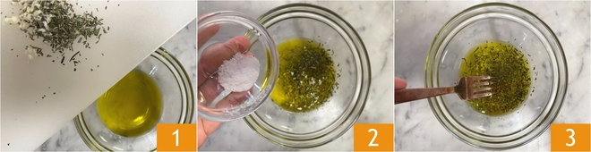 To make the beef roast, first finely chop the garlic and rosemary needles. Pour 2 tablespoons of oil into a small bowl, add the chopped garlic and rosemary 1 and the salt 2, then mix well with a fork 3.