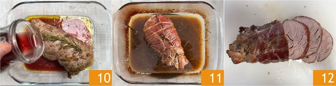 At this point, pour the red wine over the meat 10 and continue cooking for another 40 minutes at 300°F, covering the meat with a sheet of aluminum foil. A couple of times during cooking, baste the meat, ensuring not to burn yourself. Once cooked, remove the roast from the oven and let it rest for about ten minutes before removing the string 11. Cut your roast beef into slices 12 and serve them drizzled with the cooking juices!