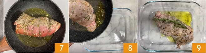 Brown the meat on all sides to seal it 7. When the roast is well-browned, transfer it to a baking dish along with the cooking juices, ensuring the bottom of the dish is well greased 8. Cook in a preheated static oven at 300°F for about 20 minutes 9.