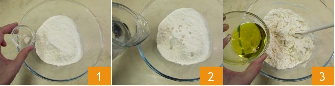 To prepare the rolled focaccia, combine the two flours in a bowl, add the fresh yeast 1 and pour in part of the room-temperature water 2. Mix with a wooden spatula, then also add half of the oil 3