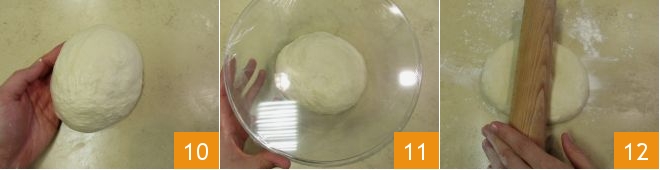 just long enough to shape it into a ball, by rounding the dough 10. Place it in a lightly oiled bowl, cover with plastic wrap 11, and let it rest for at least 12 hours at room temperature away from drafts. After the indicated time, take the dough and roll it out with a rolling pin on a lightly floured surface 12: you should get a rectangle about 20 inches long.