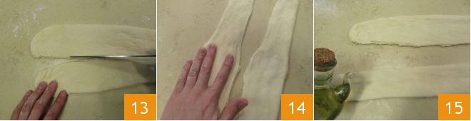 Divide the rectangle in half lengthwise 13, then spread and press lightly with your fingertips on the two strips obtained; dress the surface with a drizzle of oil 15,