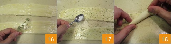 a bit of dried oregano 16 and flaky sea salt 17. Twist each strip onto itself, as if creating a breadstick, starting from one end 18