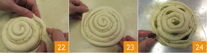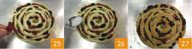 Fasten the other strip at the end of the spiral and continue the circle you started (22-23). Your rolled focaccia is ready: oil a baking sheet and place the rolled focaccia on it. Divide the pitted green and black olives in half lengthwise, then insert them here and there between the grooves of the spiral 34