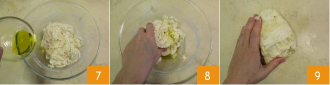 the remaining oil 7 and start kneading by hand 8, then transfer the dough to a lightly oiled work surface and handle it 9