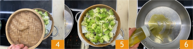 Close the steamer basket and steam for 10 minutes 4. After this time, remove the lid (be very careful of the steam that will escape) and check that the florets have softened 5. In a pan, pour the extra virgin olive oil 6.