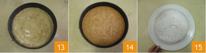 Bake the cake 13 in a static oven preheated to 320°F (160°C) for 50 minutes. Once baked, remove the Altamura Rosata 14, let it cool slightly, then remove it from the pan and garnish the surface with powdered sugar as desired 15.