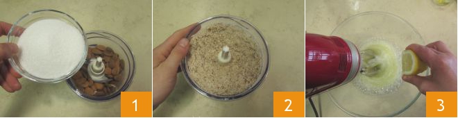 To make the Altamura Rosata, first place the almonds in the mixer bowl along with 50 g (1.76 oz) of sugar taken from the total amount 1. Operate the mixer blades to obtain a sandy, homogeneous mixture 2. Now separate the egg yolks from the whites and place the latter in a large bowl, whisk them with an electric mixer adding a few drops of lemon 3.