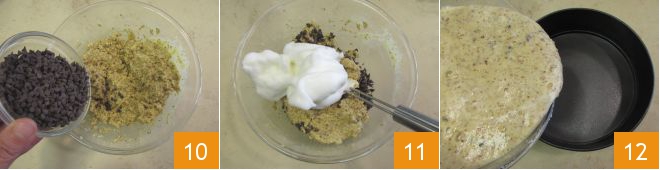 When the dough is well blended, add the chocolate chips 10 and the beaten egg whites 11, then gently mix with upward movements so as not to deflate the mixture. Pour the dough into a 9.5 inch (34 cm) diameter cake pan that you have previously buttered 12.