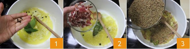 To prepare the rosemary lentil cream crostini, start by making the savory lentils with herbs: in a non-stick pan, sauté the finely chopped onion with a little oil over low heat, then add the bay leaves, juniper berries, and cloves 1. Finely chop the smoked bacon, into strips or cubes, then add it to the onion 2. When the onion is wilted, add the dry lentils 3.