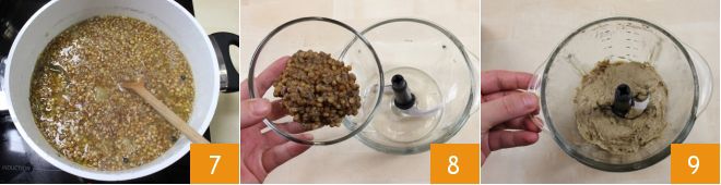 Once the lentils are ready 7, transfer them to a mixer 8, keeping some aside for the final garnish, and puree them 9, then melt half of the butter specified in the recipe in a non-stick pan.