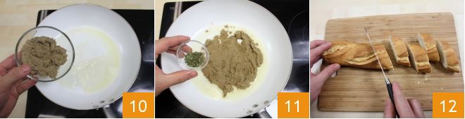 Add the lentil cream 10 to the melted butter, the chopped rosemary 11, and, if desired, a little water to make the cream more fluid; mix everything, being careful not to let the mixture dry out too much. Slice the bread 12 and in another pan melt the remaining butter,