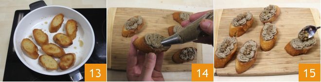 in which you will toast the crostini for a couple of minutes 13, turning them on both sides. Now transfer the lentil cream to a piping bag and squeeze some onto each crostini 14, finally garnish with some of the lentils you set aside 15, using a teaspoon, and a few sprigs of rosemary.