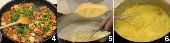 add the chopped parsley 4, stir and turn off the heat. Prepare the polenta by pouring water into a pan (preferably non-stick) and bring it to a boil: add the salt and then the extra virgin olive oil, then pour the cornmeal into the boiling water, stirring vigorously with a whisk 5 to prevent lumps from forming. Let it cook over low heat for at least 5 minutes, stirring continuously 6, then turn off the heat and