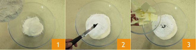 To prepare the ruby chocolate tart, start with the Shortcrust pastry: in a bowl, combine the flour, powdered sugar 1, seeds from the vanilla bean 2, and cold butter cut into pieces 3.