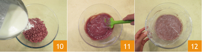 As soon as the cream reaches a simmer, pour it over the ruby chocolate pearls 10. Stir vigorously with a spatula 11, emulsifying everything slightly, then cover with plastic wrap and refrigerate for at least 2 hours 12.
