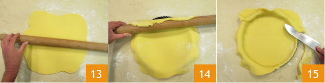 Meanwhile, retrieve the shortcrust pastry, roll it out on a lightly floured surface to a thickness of about 1/8 inch 13, wrap the dough around the rolling pin, and unroll it into a 9-inch mold 14. Trim the edges using a smooth knife 15.