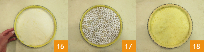 Place a sheet of parchment paper at the bottom of the dough 16 and use ceramic weights for How to do blind baking 17: bake the tart in a static oven, preheated in static mode, at 350°F for about 20 minutes 18.