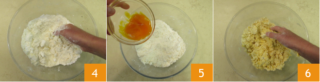 Work the ingredients with your fingertips to obtain a coarse sandy mixture 4, then add the egg yolks 5 and knead quickly 6.